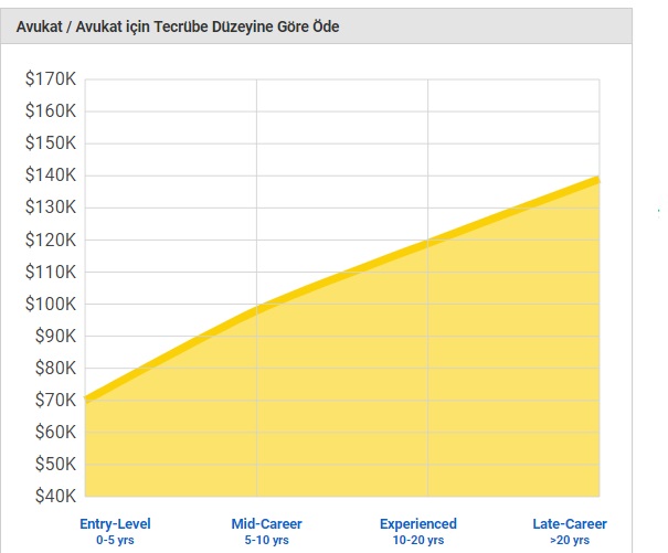 Amerika’da avukatların gelirlerini incelerken avukat deneyim kriteri göz ardı edilemeyen bir faktördür..Bir avukatın deneyimi arttıkça gelirinin eğilimi dikey yönde bir seyir izler. Avukat için tecrübe ile ödeme korelasyonu arasında olumlu bir eğilim vardır. 5 yıldan az deneyime sahip bir giriş seviyesi Avukat / Avukat, anonim kullanıcılar tarafından sağlanan 7.796 maaştan ortalama 70.000 dolar tazminat alabilmektedir. Ortalama toplam ücret, ipuçları, bonus ve fazla mesai ücreti içerir. 5 ila 10 yıllık deneyime sahip çalışanları içeren bir orta-kariyer deneyimine sahip bir Avukat / Avukat, 4.276 maaştan elde edilen ortalama 98,000 dolarlık bir tazminat alabilmektedir. 10 ila 20 yıllık deneyime sahip çalışanları içeren deneyimli bir Avukat / Avukat, 3.312 maaştan oluşan ortalama 119,000 dolar tazminat alabilmektedir. 20 yılı aşkın deneyime sahip çalışanları içeren geç kariyer deneyimine sahip bir Avukat / Avukat, ortalama 139 ABD Doları tazminat alabilmektedir.