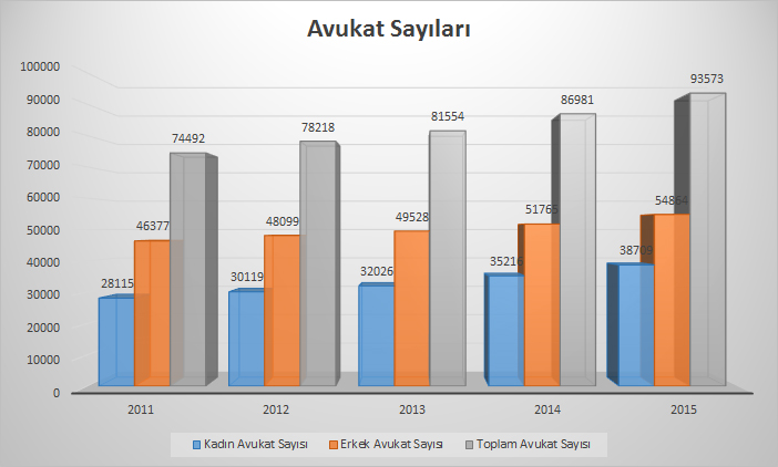 Son beş yılın avukat sayıları göz önünde bulundurulduğunda, en büyük yüzdesel ve sayısal artış 2015 yılında gerçekleşti. 2015 yılında avukat sayısı %7,58 arttı. Geçtiğimiz yıla göre 6592 avukat, stajyerlik görevini tamamlayarak, avukatlık ruhsatnamesine sahip oldu. Son 5 yılın avukat sayılarını ve artış grafiğini aşağıda görüntüleyebilirsiniz.