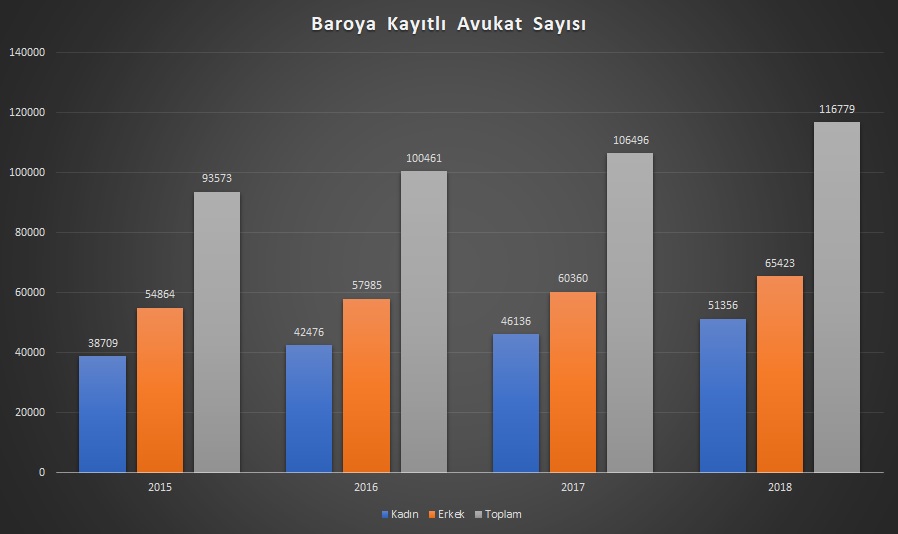 Son dört yılın kayıtlarına bakıldığında baroya kayıtlı avukat sayısının %24,80 arttığı gözlenmektedir. Artışta ki en yüksek pay kadın avukat sayısında gözlenmiştir. 2015 yılında baroya kayıtlı kadın avukat 38709 iken 2018 yılında bu sayı yaklaşık %32,67 artış ile 51356 kişiye yükselmiştir.