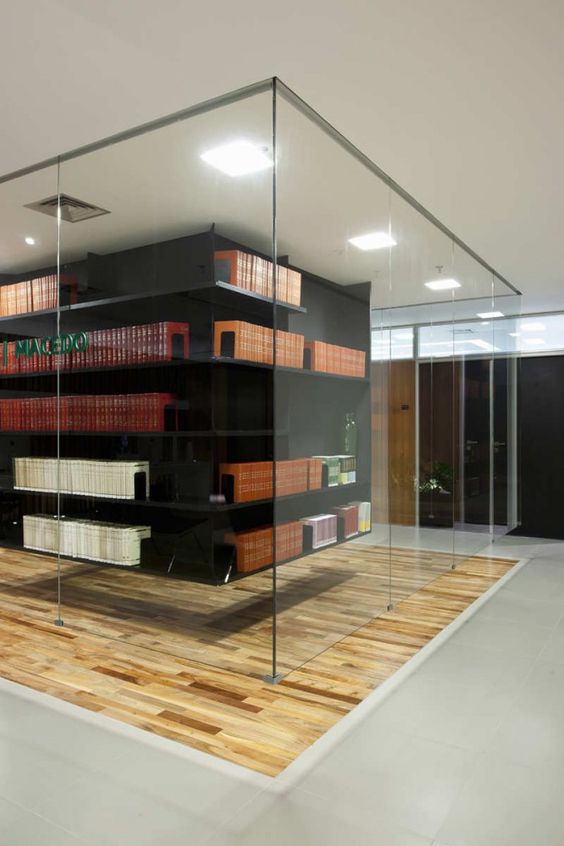 Ofis ortak alanına kurulmuş cam bir kütüphane ile dikkat çekici hem de alandan kazanılabilir.
