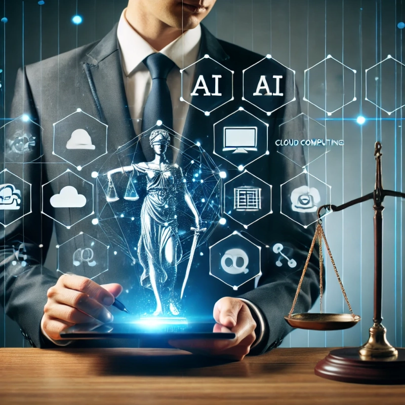 DALL·E 2025-02-12 16.27.43 – A modern law office embracing digital transformation. The image features a lawyer using a tablet with holographic icons representing legal technology,