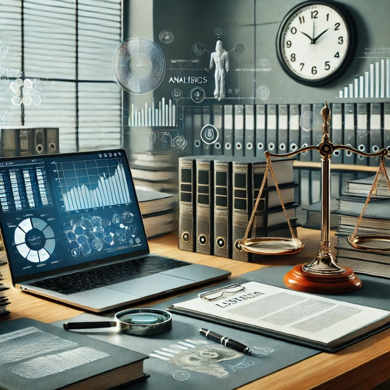 DALL·E 2025-02-13 15.28.08 – A modern law office with a professional workspace. A desk with a laptop displaying analytics and legal software, surrounded by neatly stacked legal do