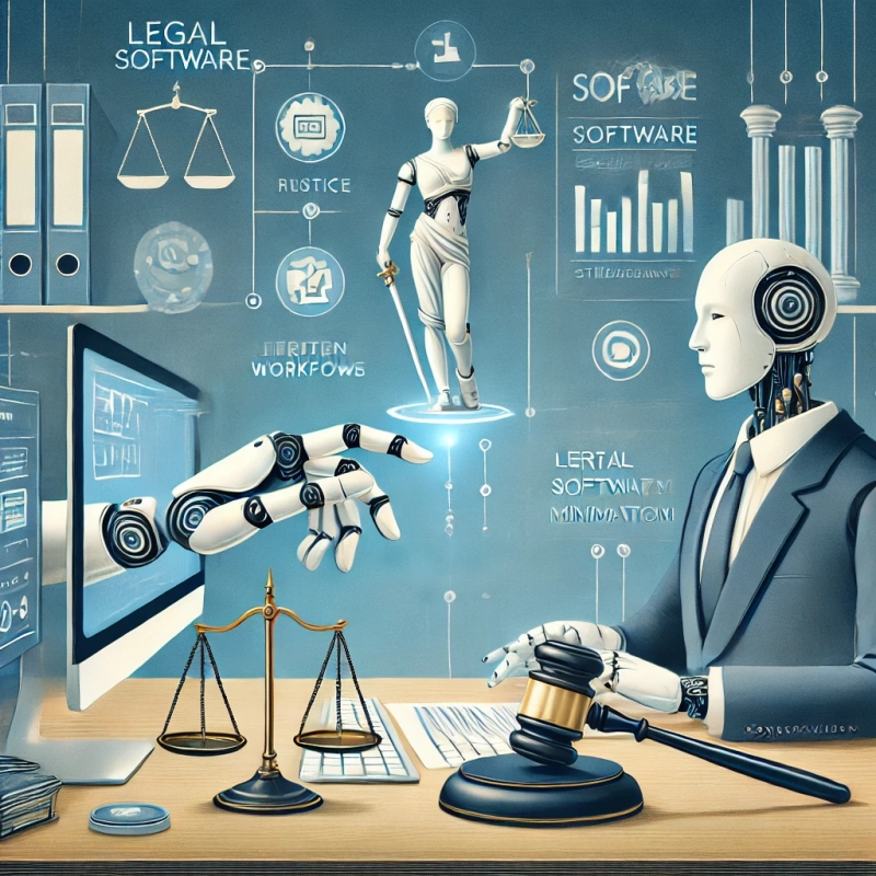 DALL·E 2024-12-11 15.02.49 – A visually engaging and professional graphic depicting the concept of automation in law firms. The scene includes a modern law office with a robotic h