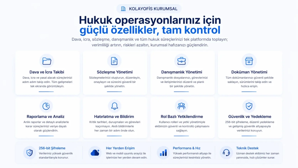 Tüm dava ve hukuk süreçlerini tek sistem altında toplayarak operasyonel karmaşayı azaltır.