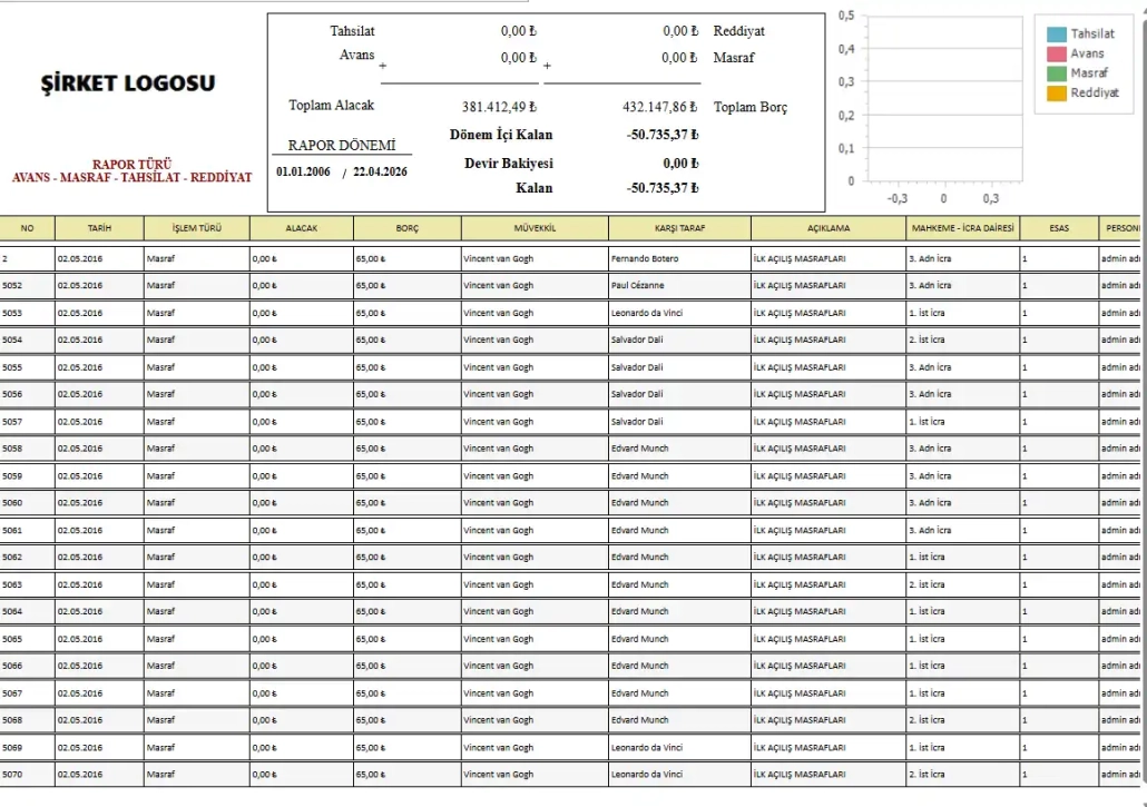 Dosya ve müvekkil bazlı; avans, masraf, ödeme, tahsilat, vekalet ücreti gibi işlemlerinizi sistem üzerinden yapabilirsiniz. Müvekkillerinizin yanı sıra personel, merkez kasa ve banka kartlarınız ile ilgili her türlü işlemi KolayOfis NG Hesap Avukat Muhasebe Programı ile gerçekleştirebilirsiniz.
